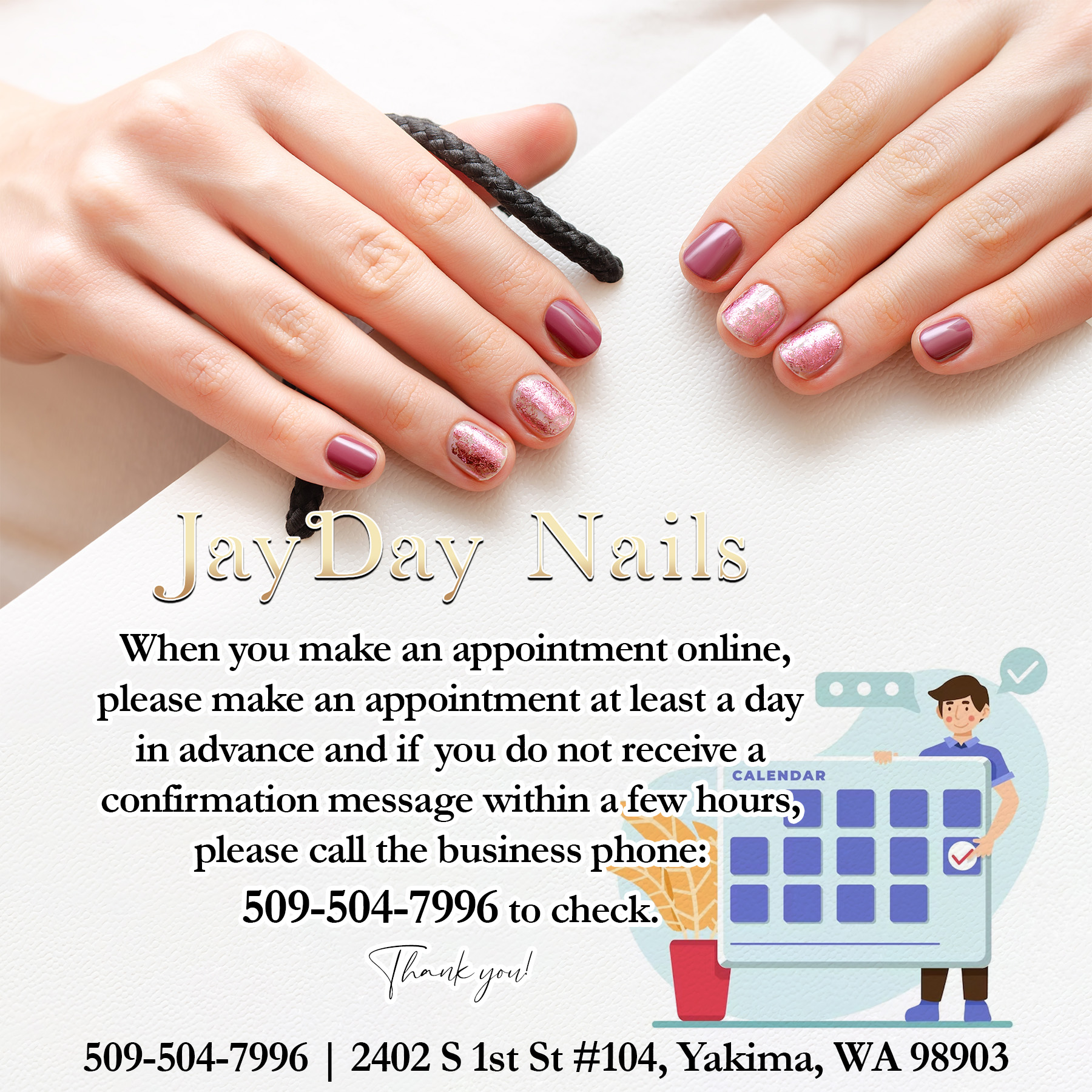 Let’s visit, have a relaxing time, and become prettier after enjoying high-end services at one of the best Nails Salons in Yakima: JayDay Nails